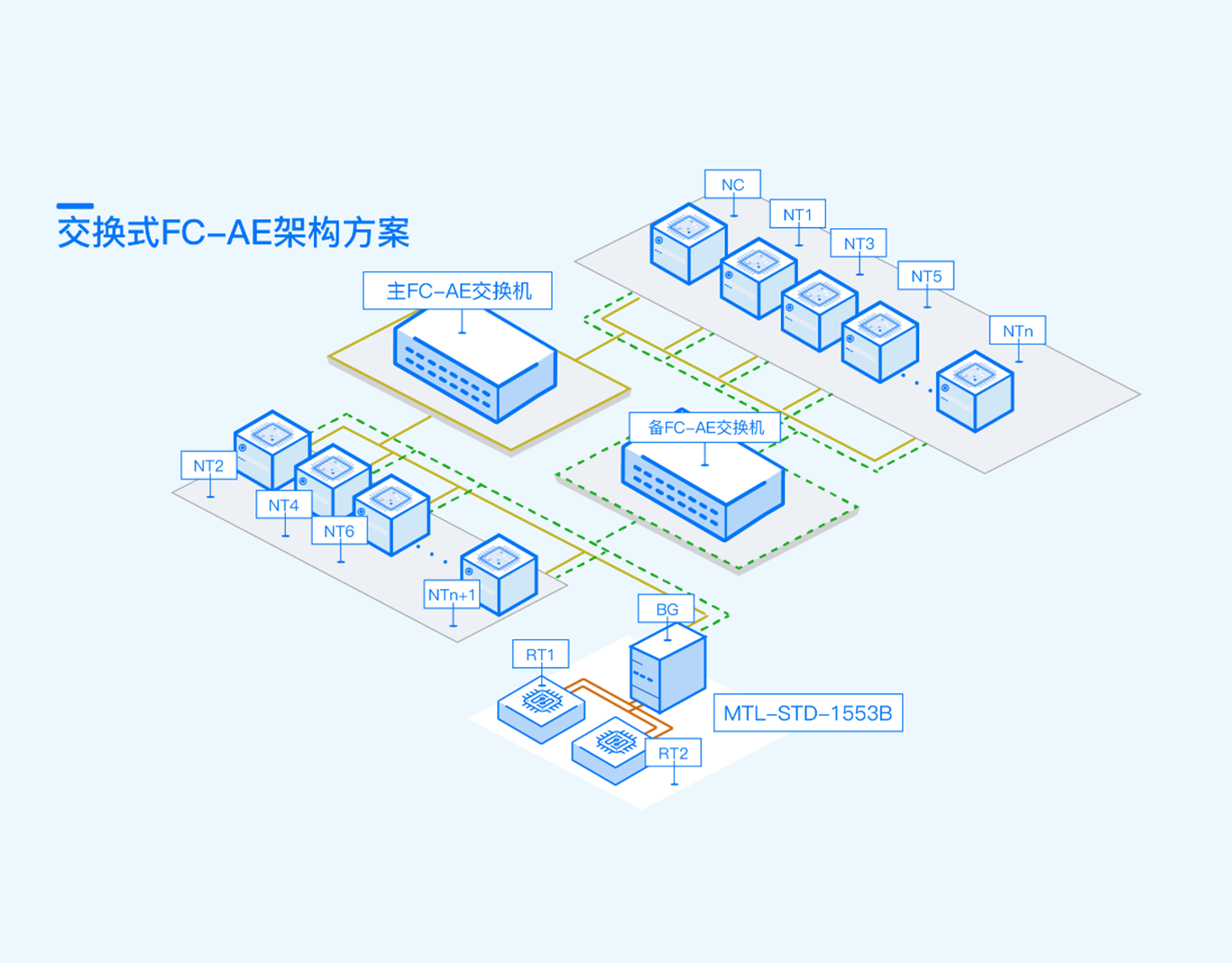 交换式FC-AE网络架构方案通过交换机实现NC、NT、BG的有机互联,通过BG实现传统1553B总线设备的无缝连入。FC交换机为各网络终端提供无阻塞低延时的数据交换,通过交换机级联方便实现网络扩展。